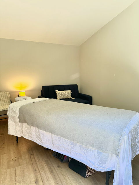 "Lizard's Lounge" and can be used as a massage / wellness consultation room OR a bedroom for one person. It cannot be used as both for the same retreat as there is not enough space for a bed and massage table. Lizard's Lounge is super cozy and has it's own heat/ac unit for temperature control. The nearest bathroom is in the pavilion. This space is included in our standard pricing packages.